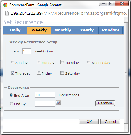 Enter the start date for your recurrence (this date will be the same in the end date field as this is only considering the first occurrence). Enter the start and end times for the reservation. Check the Recurrence checkbox. The Recurrence Form displays.