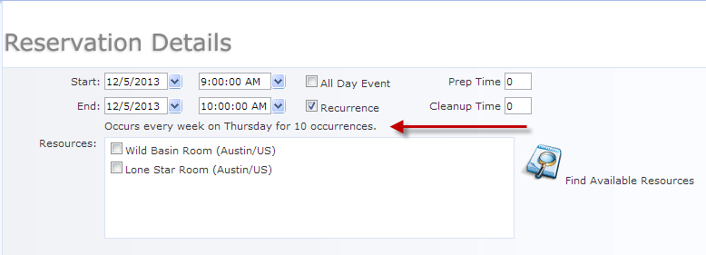 Click OK. The recurrence pattern is saved, and you are returned to the Reservation Details form. The recurrence pattern displays just below the end date field.