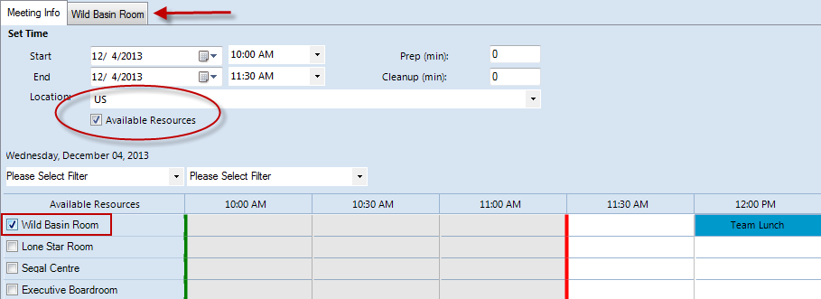 Select a resource that is available for the selected date and time by checking the box next to the Resource name on the Reservation Grid. To narrow your view to only available resources, check the Available Resources option just below the location menu.